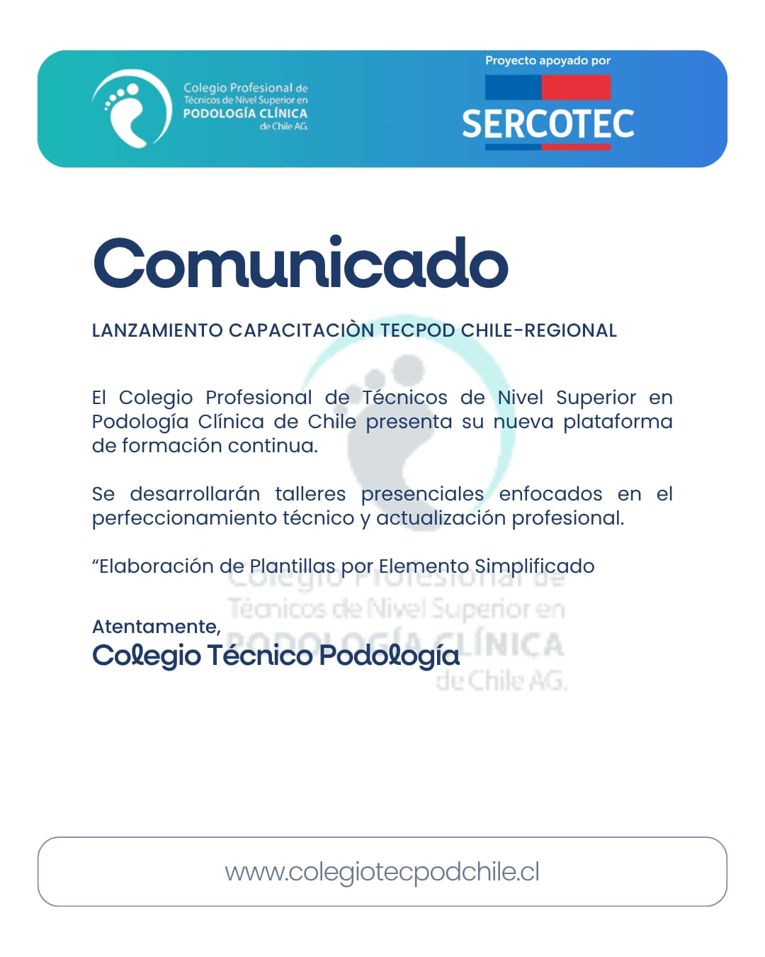 El Colegio de Técnicos de Nivel Superior de Podología Clinica de Chile es una Agrupación profesional constituida como asociación gremial...